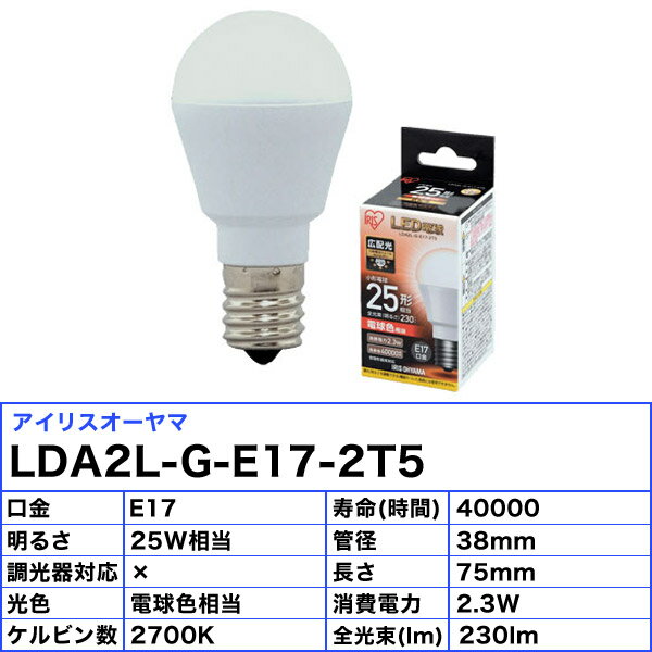 Lda2l G E17 2t5 小型電球型ledランプ 5個単位販売 アイリスオーヤマ 25w形相当 広配光タイプ 180 Ac100 密閉形器具対応 電球色相当 全光束 約230lm 消費電力 約2 3w 全長75mm 外径38mm E17口金 寿命 h 5年保証 旧 Lda3l G E17 2t3 Ir の通販